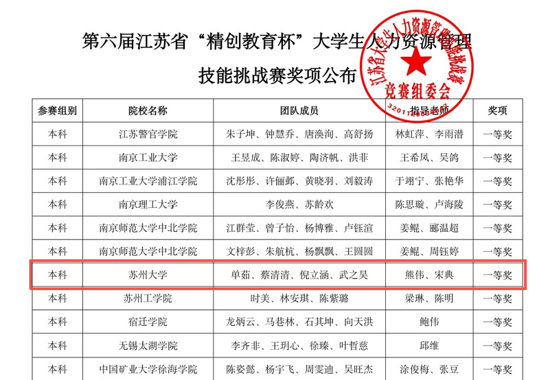 近日,第六届江苏省(精创教育杯)大学生人力资源管理技能挑战赛圆满落幕,永利皇宫 学生单茹、蔡清清、倪立涵、武之昊组成的亚洲色情-韩国黄色电影-欧美色情 代表队在此次比赛中沉着应战、奋勇争先,在全省众多高校参赛队伍中脱颖而出,荣获江苏省一等奖,充分展现了永利皇宫 学子扎实的专业功底与优秀的综合素养!