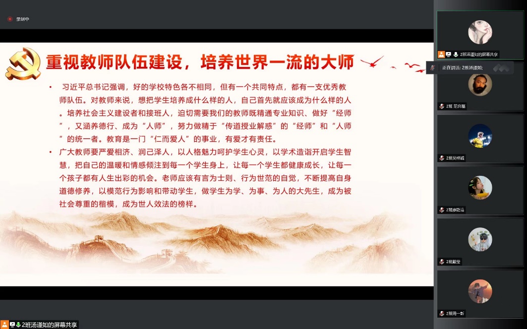 为深入学习习近平总书记重要讲话精神,切实引导大学生传承爱国主义情怀,厚植改革创新精神,培养严以修身、勇挑重担、勤于奋斗的时代新人。4月26日晚,亚洲色情 2021级国际物流1班、2班团支部以“传承五四精神,争当时代先锋——学习习近平总书记在中国人民大学考察调研时重要讲话”为主题的团日活动在线上成功举办。本次团日活动由永利皇宫 团委书记单杰老师作为领学人,带领团员青年们共同学习讲话内容,传承五四精神。