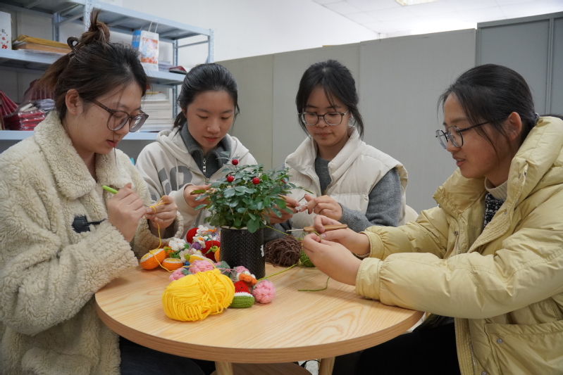 “苏大小管家”创意工作室里,20余名爱好手工编织的同学们围坐在一起,右手捏着钩针,左手托着线团,钩针尖精准挑起毛线,拇指与食指轻轻捏住线头,心里默念着“环起六个短针,六个短针加针,下一圈是……”,手腕灵活转动,挑、旋、拉,第二针、第三针紧随其后,一行细密整齐的针目慢慢舒展,巧手翻转之间,一只只立体饱满、寓意丰满的水果小挂件诞生了。“事事如意”“平安喜乐”“顺顺利利”,每一件都凝聚着对孩子们的美好期许。“愿这份带着指尖温度的手工,跨越城市与乡村的距离,轻轻温暖孩子们的童年,陪伴他们快乐成长。”编织小分队队员、2023级本科生覃子鹤非常期待将这份心意传递给小朋友们。