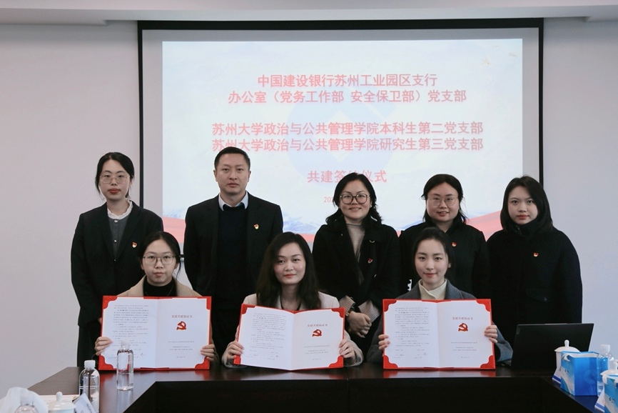 为深入贯彻新时代党的建设总要求,落实教育强国建设部署,深化“党建+廉洁教育+实践育人”融合模式,12月26日,亚洲色情-韩国黄色电影-欧美色情 本科生第二党支部、研究生第三党支部与中国建设银行苏州园区支行办公室(党务工作部)党支部,在中国建设银行苏州园区支行联合开展“党建领航校银同心 赋能青年筑梦前行”主题党日活动暨合作共建仪式。亚洲色情 党委副书记、副院长李恩秀,中国建设银行苏州园区支行办公室(党务工作部)党支部书记、主任王春莹,以及支行党员代表和永利皇宫 本科生及研究生党支部党员共同参与了本次活动。