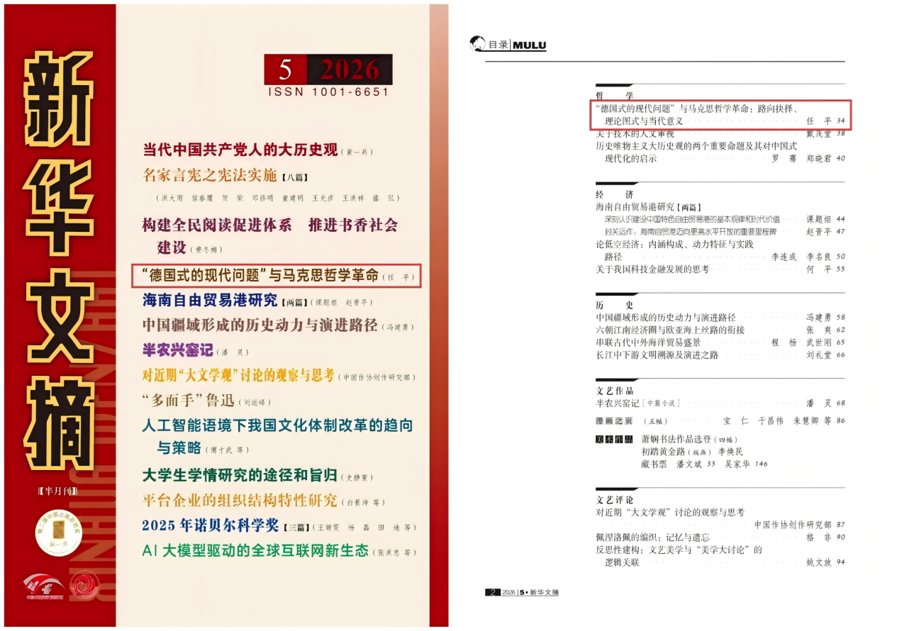 近日,永利皇宫 任平教授文章《“德国式的现代问题”与马克思哲学革命:路向抉择、理论图式与当代意义》(刊于《世界哲学》2025年第6期)获《新华文摘》2026年第5期全文转载并封面推荐。《新华文摘》创刊于1949年,是大型理论性、综合性、资料性文摘类权威期刊。创刊以来荟萃时代精品、凝聚人文精华,集中展示了我国哲学社会科学及相关领域“百花齐放、百家争鸣”的成果,为广大读者提供了大量哲学社会科学新观点、新资料、新方法和文艺佳作。