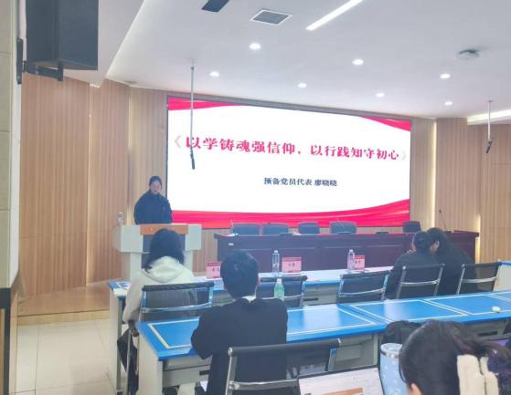 此后,入党积极分子代表和预备党员代表分别发言。入党积极分子代表覃子鹤以“学思行”为脉络,分享她作为一个陕西人从“知党”到“爱党”、从“心动”到“行动”的成长历程。她表示,将以延安精神为指引,深耕理论学习、立足专业实践、投身志愿服务,以终身修行践行“思想上入党一生一世”的誓言,争取早日成为正式党员。预备党员代表廖晓晓围绕“马克思主义为什么行”“如何践行活的马克思主义”,从真理与实践维度阐释其时代价值。她表示,将发挥专业优势深化理论学习,在学习生活中发挥先锋作用,坚持学思用贯通、知信行统一,以坚定信仰与实干担当践行初心,努力成为新时代合格党员。